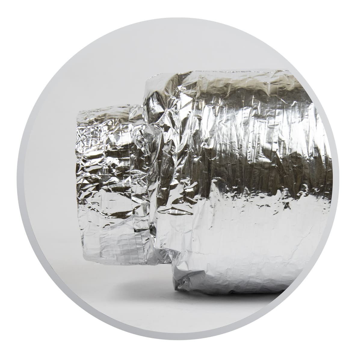 Наружный слой из алюминия, ламинированного полиэстером, надежно защищает изоляционный материал и внутренний воздуховод от деформации, нарушения целостности.
