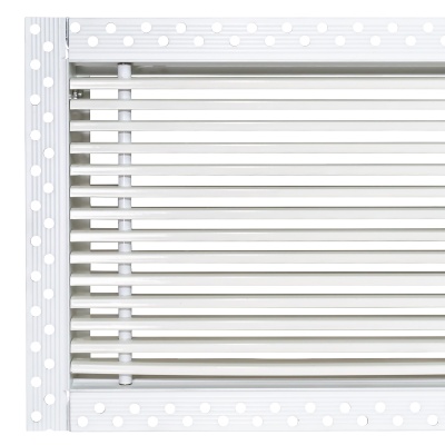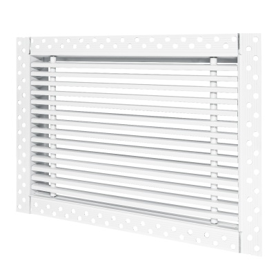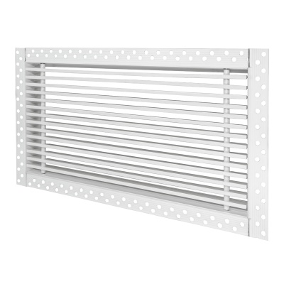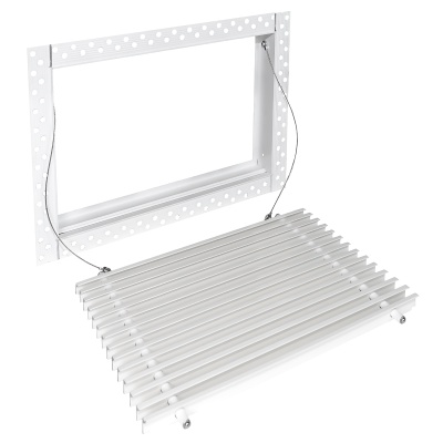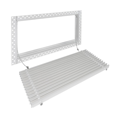 Данная решетка подходит для монтажа на любую поверхность под финишную отделку. Рамка и экран изготовлены из алюминия, опора экрана - из оцинкованной стали. Рама оснащена «полкой» 1,9 мм и рифлеными краями для большей адгезии финишного материала – шпатлевки, цемента. Решетка имеет съемную центральную часть с фиксированным углом наклона ламелей 0°. Она крепится к корпусу прочными металлическими тросиками, легко снимается для очистки и удобного обслуживания.
